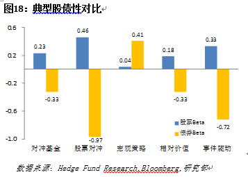 在收益率上,系统性宏观策略在经济增长晚期的收益表现一枝独秀,在早期和后期的表现也堪称优异(图17)。系统性宏观判断策略尽管中期它的表现不如其他策略,但是可作为经济下滑时的良好对冲工具。另外,在策略的股性和债性上,四类典型策略具备鲜明的股性特征。其中,宏观策略股性最低,仅为0.04,其收益基本与股市表现互不相关(图18)。因此,宏观策略作为分散风险的投资标的是十分可靠的。