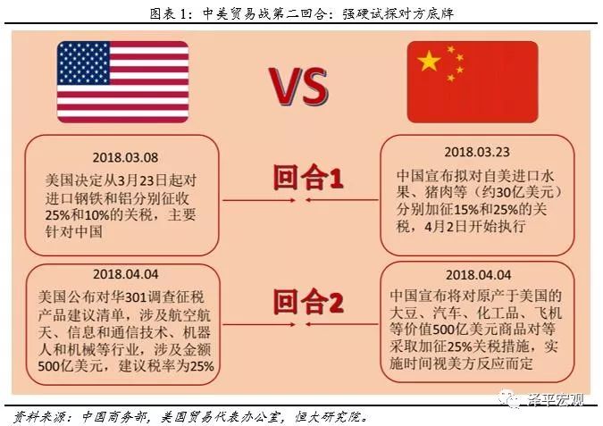 1、中美针锋相对,时间高度衔接,且力度、规模完全对等。在第一回合,美国3月8日宣布从3月23日起对进口钢铁和铝产品分别加征25%、10%的关税;3月23日中国宣布拟对自美进口水果、猪肉等价值30亿美元产品分别加征15%、25%的关税,4月2日开始执行。在第二回合,美国3月23日表示将在15天内公布对华500亿美元商品加征25%关税建议清单,4月4日凌晨美国公布建议清单后,中国于当天下午公布同等规模同等力度对美加征关税清单。与以往不同,更加强大的中国在本次中美贸易冲突中表现得更有自信、更有底气。