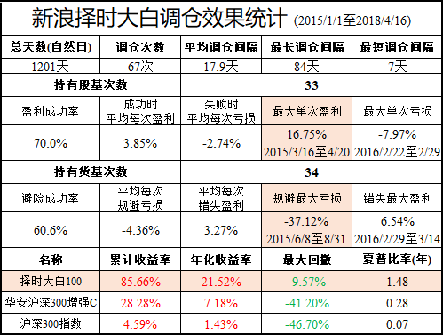 过去三年多来(2015年1月1日——2018年4月16日)择时大白的调仓表现如何呢?我们看下表: