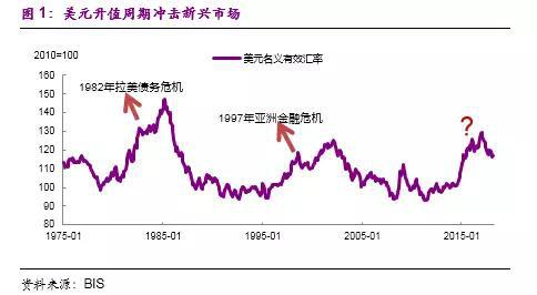 回顾一下历史。从1970年代到现在,美元有三次大的升值周期,前两次都伴随着新兴市场国家的金融危机。