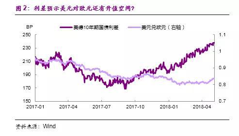 从美国10年期国债和德国10年期国债的利差来看,在2017年上半年,汇率和利差的变动是一致的,2017年下半年,美国对德国利差扩大,但美元对欧元反而是贬值,就是我上面解释的情况,今年4月以来,汇率和利差变动又一致了,美德的利差达到近几年的高点,从利差套利来看,对美元汇率是支持的。
