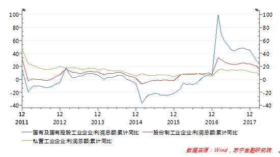 第一,去产能使得国有企业利润增速远超民营企业。2015年和2016年是产能过剩最为严峻的时期,而国有企业又是产能过剩行业的重灾区,产能过剩使得钢铁、煤炭、石化和建材等价格疲软,国有企业盈利状况急剧恶化,利润水平大幅低于民营企业的盈利增速,这成为中煤集团、东北特钢和广西有色等国有企业陷入亏损并造成债务违约的主要原因。进入到2017年,去产能之后工业品价格大幅上升,国有企业为主导的传统产业赚得盆满钵满。与此同时,由于去产能的重点是压缩民营企业产能,这使得民营企业利润增速虽然也有所回升,但远不及国企的利润增速(参见下图)。