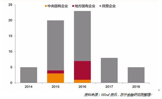 值得注意的是,在2015年和2016年,虽然违约企业中民营企业也占主导部分,但中央和地方国有企业的违约现象并不鲜见(参见下图),最为典型的是2016年的央企中煤集团、地方大型国有企业东北特钢、广西有色、四川煤炭等违约事件,产生了广泛的社会影响。