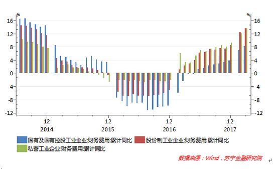 第二,资金成本回升期,民营企业财务费用上升幅度更大。在资金较为宽松的2016年,国有企业财务费用的下降幅度,要大幅高于民营企业财务费用的降幅。同样,在2017年,随着央行货币政策的持续偏紧,各行业融资成本都有明显上升,但国有企业仍然占据融资成本更低、融资条件更为宽松的优势,财务费用的涨幅也明显低于民营企业的涨幅(参见下图)。