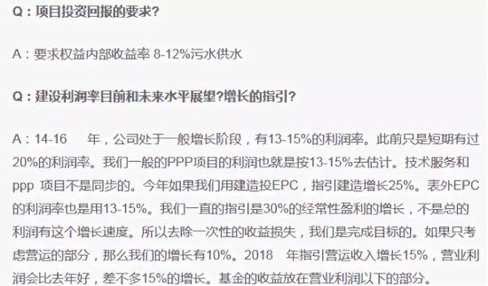 (4)全年净利润同比增速预计为20-25%,净利润指引保守的原因是由于政府现阶段对于PPP项目的政策尚未明朗,致使公司对项目投标方面较为保守。(在PPP项目政策不明朗的情况下,集团正等待政府进一步澄清,而并不是没有合同。集团现时又称,其不希望仅为获得高增长而需承担高投资风险。)