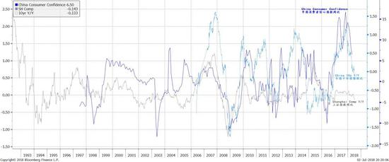 图表二:中国消费者信心从历史高位快速回落,预示着债券收益率和股票下行的压力。