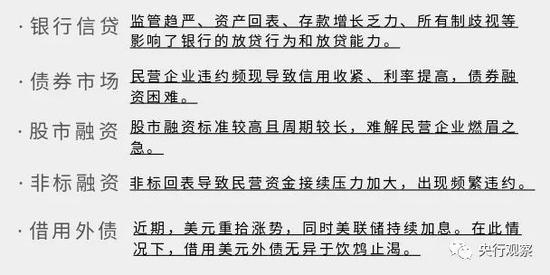 从民营企业融资渠道来看,主要包括银行信贷、债券融资、非标融资、股权融资、借用外债等方面,但是在金融监管趋严的背景下,各种融资渠道都明显受到限制,信贷之流陡然收窄、变浅,一些民营企业的资金链猛然绷紧。
