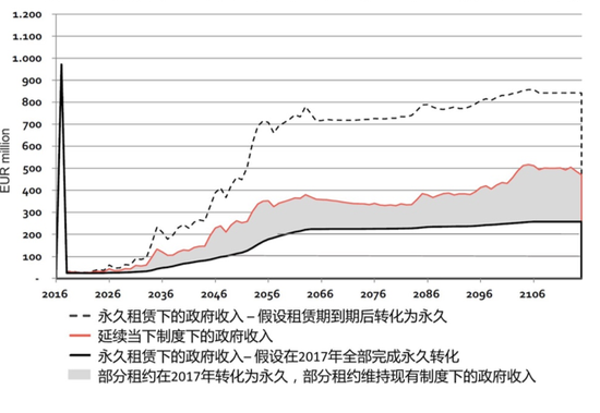 黑色的加粗的折线,是假设在2017年将全部有期限的土地租约转化为永久期限。左端出发一开始的峰值,代表着公民补交时间差额地租的政府收入,在峰值出现过后,政府这部分的收入就变得很微弱了。那么总体看来,这样的转化会对政府收入产生怎样的影响呢?
