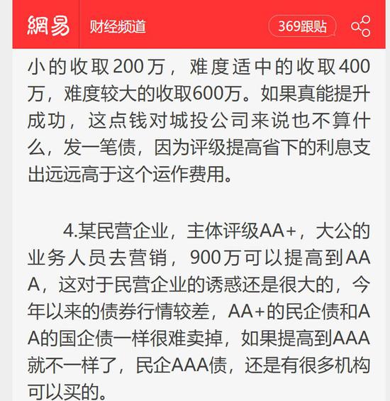 另外,据业内人士介绍,评级行业的费用不是业内通常收取的10万主体评级费用,而是看运作难度大小。难度较小的收取200万,难度适中的收取400万,难度较大的收取600万。如果真能提升成功,这点钱对城投公司来说也不算什么,发一笔债,因为评级提高省下的利息支出远远高于这个运作费用。现实是,大公的劣迹在业内早有传闻,而新光集团和西王集团也只是它的收割羊毛的对象之一而已。
