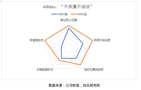 如果说库里与UA是“不被看好者”(Underdog)的携手逆袭;那么Kanye给予Adidas的,则是对品牌价值“不疯魔不成活”的颠覆性改造:相比Yeezy Boost推出前“死气沉沉”的品牌定位,Kanye为Adidas赋予了“时尚”内涵,使得原本的功能性成为时尚单品,为NMD、Ultra Boost等支线产品广开销路,从而在未提示知名度与非直接好处两项上令Adidas脱胎换骨。