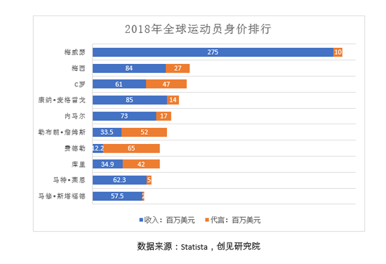 从运动员的“供给侧”看,在世界上最能赚钱的十位运动员中,足球、篮球、网球等球类运动明星的代言收入比例更高。其中勒布朗詹姆斯与斯蒂芬库里两位NBA球星的代言费都超越了各自从球队领取的天价顶薪,网坛天王费德勒的代言费甚至达到了其巡回比赛奖金总和的5倍。