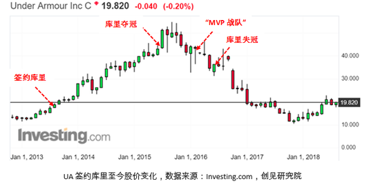 而2016年初“MVP战队”的仓促建立与夏天库里的意外失冠,标志着UA的增长奇迹由盛转衰:伴随股价一路下跌,UA不仅没能挑战Nike成功,反被Adidas夺回了亚军位置。事后看来,UA股价的转折点,正是2016年2月“MVP战队”组建的极盛之时。