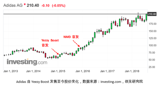 2017财年,当Nike反思策略、UA后程乏力之时,Adidas在北美的销售额同比增长却达到27%。如今,Adidas的股价已是2015年推出Yeezy Boost系列时的4倍。