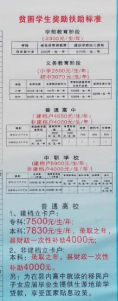 各种补贴很多。粮食直补、生活保障金、贫困学生奖励扶助金。比如某县对上普通高中的学生,建档立卡户补贴4650元/年,非建档立卡户补贴4000元/年,大学生每年补贴7000多,录取之年县财政还一次性补贴4000元。出了一个大学生看来还能养活家里至少一人。