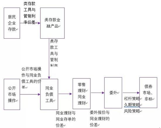 但是银行过多推出类货币产品会产生问题,它会让银行的运作模式发生改变。过去,因为市场利率高于管制利率,居民企业存款会大量向基金类产品和银行理财产品分流,而基金类产品的资金大多被投向银行同业负债工具。所以对于银行而言,分流过程将管制利率提高到了同业负债利率水平,其资金成本被提升。随后,银行同业会将资金投向同业理财以实现套利,最后同业理财会将资金投向机构委外或进行其他投资。这个过程的特点是资金成本逐渐加码。