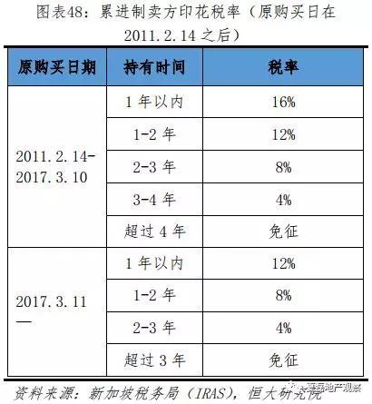 ②卖家印花税:征收标的特定、税率按持有年限累进。征收标的须符合三个条件:一是只针对所有住宅类房产及土地征收;二是原购买时间在2010年2月20日以后;三是出售时持有时间是否满足一定年限,若已满,则免征。税基与买家印花税一致,税率仍采用累进制,但根据购买时间、持有时间、买价/市价综合确定。新加坡政府并未采取一刀切式的“限售”,而是按照持有年限累进印花税率实现抑制投机的效果,一般持有年限越短,则税率越高,最高可达16%。