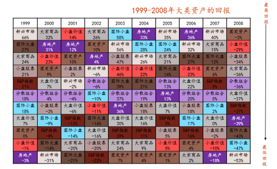 1999-2008年投资收益周期表 来源:空间基金顾问(DFA)& 汤姆森金融公司