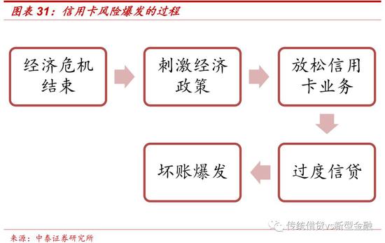 前车之鉴:消费金融行业有明显的周期性,风险的起因往往是金融危机之后的刺激政策。日本、韩国及台湾地区均发生过信用卡风险的爆发,发展路径基本一致。金融危机之后,政府出台政策刺激消费,放松消费金融的监管,消费金融行业的参与机构增加,过度竞争,信用卡滥发,监管滞后,最后导致坏账率的爆发。
