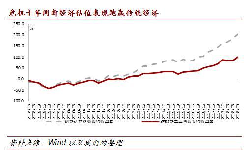 第二阶段,后危机时代。以2018年为起点,内外部因素的重大转变开启了新经济发展的新阶段,两大效应的地位发生轮换。从外部看,随着全球经济开启真实普遍复苏,全球货币政策正常化稳步推进,正在渐次修复市场扭曲,因此“信息优化效应”的相对重要性下降。相反,随着全球供给侧改革的提速,实体经济尤其是制造业,亟需重大科技突破从根本上激活增长动力,因而对新经济的“技术进步效应”尤为期盼。从内部看,经过危机十年的高速发展,基于上一代科技革新所能优化的资源配置潜力,已经基本得到利用,“信息优化效应”的增量随之放缓。新经济亟待依靠“技术进步效应”,完成新一轮科技积淀,在5G、人工智能、云计算等领域实现重大突破,才能为“信息优化效应”打开新空间。基于此,展望新阶段,“技术进步效应”将占主导地位,“信息优化效应”则居辅助地位。遵循这一模式,新经济将与制造业、服务业、农业等传统领域深度融合,通过大规模改造传统经济金融体系,实现科技进步对全产业链的正向溢出;通过强化创新驱动、服务经济总体,以扩大自身发展空间。从外在表现来看,这一趋势将体现为新经济的自身发展与实体经济的总体复苏相关性提高。