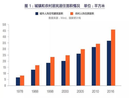 住房市场化改革的1998年,城市人均建筑面积和农村人均住房面积分别为18.7平方米和23.3平方米;经过近20年的奋斗,城市和农村居民的居住面积几乎翻了一番,2016年两者分别达到36.6 平方米和45.8平方米,按人口加权全国居民人均住房建筑面积达到40.8平方米。