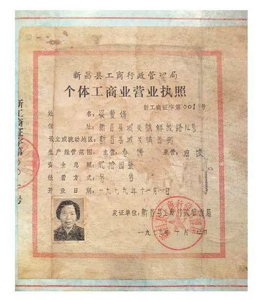 “新工商证字第001号”,核发时间“1979年10月25日”,这是中国目前能找到的首张个体户营业执照,持证人“梁爱娟”,主营为“春饼”、兼营为“油饺”、资金总额为“贰拾园整”。由此开启了中国个人经营的序幕。