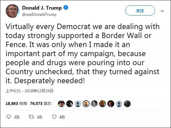 更大的困难来自特朗普想建美墨边境墙,但自从中期选举民主党掌控众议院后,特朗普手脚开始受限。因两党分歧,预算案无法通过,联邦政府在平安夜这天不得不关门。