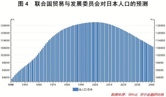 与之形成鲜明对比的是年轻人口比例与人口总数的双双下滑。Wind数据显示,日本0-14岁人口所占比重自上世纪70年代中期开始逐年下降,到了2017年,其数值仅为12.89%,与1960年的30.15%相比,降幅多达17.26个百分点(参见图3);与此同时,近些年日本的总人口规模也开始下降,2017年为1.263亿人,比2010年减少了101.1万人。按照联合国贸易与发展委员会的预测,未来相当长一段时间内,日本人口规模还会继续下降,到2050年将滑落至1.09亿人(参见图4)。
