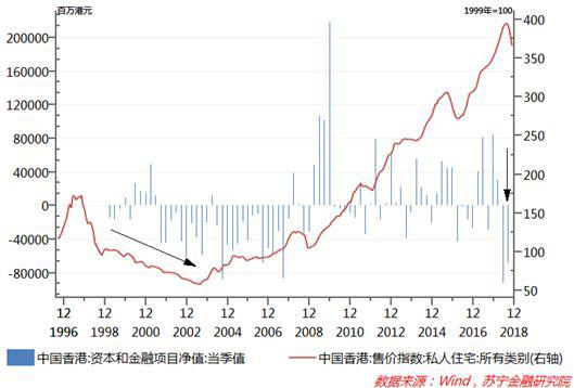 二是香港从资本流入正在转向资本流出。资金充裕是助推香港房价上涨的又一关键要素,但这一现状也在发生改变。美联储的持续加息,使得香港同样面临资本流出的压力。同时,中国央行加强了资本流出的管制,内地流入香港楼市的资金也在大幅缩减。2018年的二、三季度,香港国际收支平衡表中资本和金融项目连续两个季度出现大规模逆差,逆差规模分别为935.42亿港元和690.64港元(参见下图)。也正是二季度出现创历史新高的逆差后,香港楼市才开始掉头向下。至2018年12月,香港住宅价格指数已连续6个月下跌,香港楼宇买卖合约3038套,其中住宅仅成交了2026套,同比下滑了61.4%,成交量创下了近二十来的最低水平。