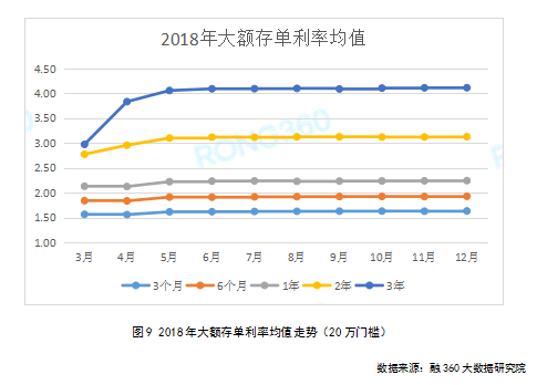 分期限来看,2018年一年以内期限定期存款利率表现平稳,两年、三年、五年期限在下半年上涨明显。据融360大数据研究院统计显示,2018年12月三年、五年期限存款利率均值分别为3.333%和3.445%,均为2018年的最高值。可以看出,银行在长期稳定负债方面的压力相对较大。融360大数据研究院分析认为,银行长期负债压力较大的原因主要有两个:一是互联网宝宝等互联网理财产品的发展,导致银行存款“搬家”,最终又以同业存款的方式回到银行,存款稳定性变差,所以加剧了银行在长期稳定负债的争夺;二是监管指标的压力。流动性匹配率等监管指标的要求,同业业务受到监管限制,一般性存款成为银行主要竞争的资金来源。