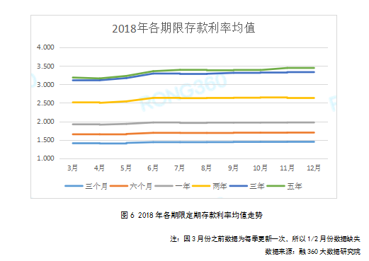 融360大数据研究院监测数据显示:2018年一年以内期限定期存款利率表现平稳,两年、三年、五年期限在下半年上涨明显。2018年12月三年、五年期限存款利率均值分别为3.333%和3.445%,均为2018年的最高值。