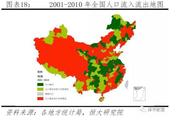 从地域分布看(红色表示人口净流入,深绿色表示人口净流出中的人口减少,浅绿色表示人口净流出中的人口正增长,灰色表示数据空白),在2001-2010年,扣除西北地区、西藏小量人口净流入外,人口净流入地区主要在东南沿海、华北、辽宁等地,而人口净流出地区主要在华中、华南(不含广东)和西南、黑龙江、吉林等地。到2011-2017年,扣除数据大幅缺失的新疆、西藏外,人口净流出地区主要集中东北地区、中西部的大部分地区以及东南沿海的非核心城市等,人口净流入地区明显变少、且趋向破碎化,主要在全国主要大城市及周边地区,包括广深佛珠肇、京津、沪宁杭苏常、合肥、南昌、石家庄、郑州-洛阳、武汉、长沙-岳阳、济南、青岛、西咸、成渝、昆明、贵阳、南宁、呼包鄂,以及广西桂柳及桂东南地区、粤西、苏北、晋中南、川西川北等。