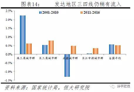 进一步细分,与一般三四线城市明显不同,发达城市群的三四线城市人口仍稍有流入。2001-2010年、2011-2016年,珠三角城市群的三四线城市年均增速分别为2.24%、0.61%,长三角城市群三四线城市群分别为0.52%、0.78%。与两个时期全国人口平均增速0.57%、0.51%相比,珠三角城市群三四线城市在2001-2010年人口明显流入、2011-2016年略有流入,长三角城市群三四线城市在2011-2016年人口稍有流入。而在中西部城市群,三四线城市人口多为净迁出。比如,成渝城市群扣除成都、重庆主城九区后,两个时期人口年均增速分别为-1.3%、0.48%;而长江中游城市群扣除武汉、长沙、南昌后,两个时期人口年均增速分别为0.03%、0.35%。