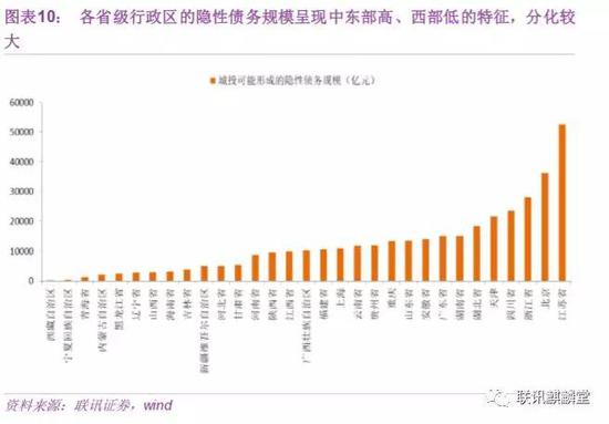 仅看城投平台可能形成的隐性债务(简称隐性债务,下文若无特别说明,隐性债务均为该口径),各地区差距较大,最高超过了4万亿,最低不足千亿,呈现与中东部高、西部低的格局。