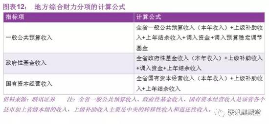 分母项,地方政府综合财力包括一般公共预算收入(扣除债务收入)、政府性基金收入(扣除债务收入)、国有资本经营收入三本账,计算方式列在图表12中,计算结果如图表13所示,具体数据来源于全省/市/自治区的财政决算表。