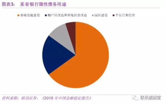 以央行在《2018年中国金融稳定报告》中调研的某省为例,该省银行隐性债务65%用于基础设施建设,20%用于棚户区改造和异地扶贫改造,10%用于园区建设,5%用于平台日常经营。