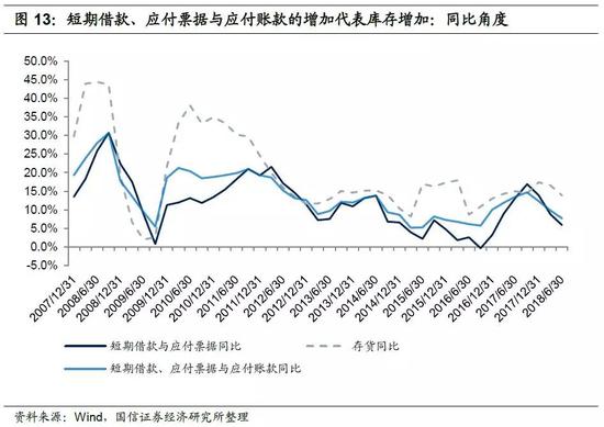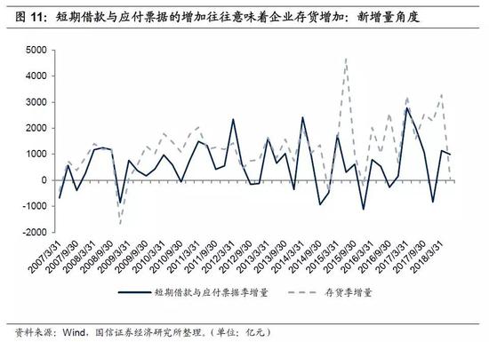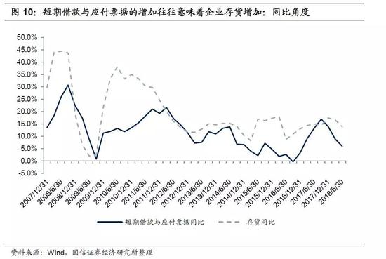 短期融资增加意味着企业存货增加。我们统计了Wind中所有在2006年到2018年有连续时间序列数据的企业(包括非金融上市公司和发债企业),从样本企业资产负债表汇总数据来看,短期借款以及应付票据的增速与存货增速相关性是非常明显的。因此当社融中的企业短期融资增量较大时,我们可以大体推断出企业存货正在增加(但从企业资产负债表或者社融数据中无法区分企业是在补库存还是产成品积压)。