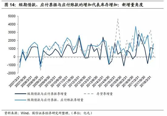 从企业角度来讲,短期融资一般用于短期资金周转,其用途包括补库存、支付工资及其他经营管理费用,其中以补库存最为主要。因此我们可以简化推断,企业借入短期借款一般会用于采购原材料,或者说积压了产成品卖不出去,就需要借入短期贷款维持企业运营。我们统计了Wind中所有在2006年到2018年有连续时间序列数据的企业(包括上市公司和发债企业),从样本企业资产负债表汇总数据来看,短期借款以及应付票据的增速与存货增速相关性是非常明显的。因此当社融中的企业短期融资增量较大时,我们可以大体推断出企业存货正在增加。