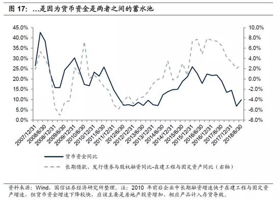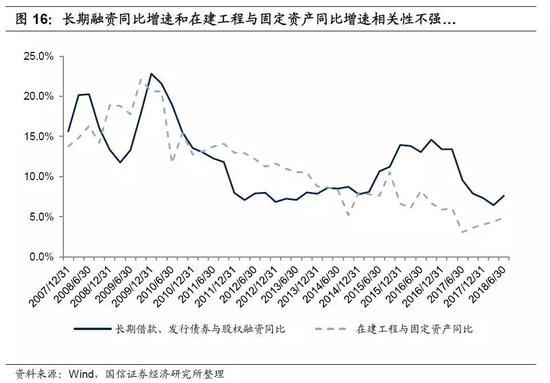 也就是说,企业募集资金用于固定资产投资的情形中,长期融资与固定资产投资之间的不同步性,会导致企业货币资金产生临时性剩余,而当企业想要投资却无法进行外部融资时(或无需进行外部融资时),就会动用历史上的现金积蓄,这是发生在2011-2013年的情况。除此之外还有另一种情形,就是企业通过中长期融资募集到资金之后,出于种种原因没有马上进行投资,就会产生大量闲置货币资金,这部分货币资金将随着债务的偿还而逐渐减少,这是2015-2016年发生的情况。所以说,企业中长期融资的增加,可能代表了资本开支增加,也可能只是货币资金增加。