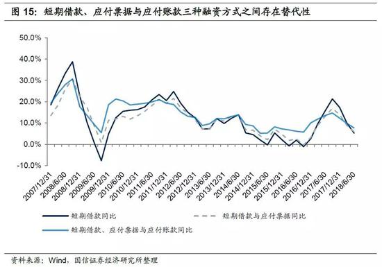 此外,从短期借款同比、短期借款与应付票据同比、短期借款与应付票据和应付账款同比来看,越是后者走势越平滑,意味着从企业运营角度来讲,三种融资方式存在一定的替代性。由于应付账款与企业短期融资之间有一定替代性,因此社融这一统计数据还有待完善(社融只是反映了金融体系与实体经济之间的互动,但没有反映实体经济内部企业之间的“直接融资”)。