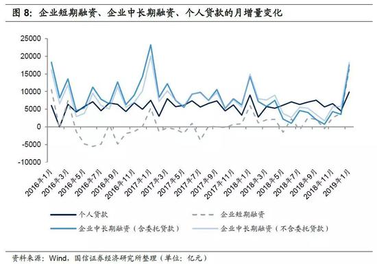然后是短期贷款,1月企业短期贷款也较多,我们预计与国办2018年11月牵头督办的要求地方政府、大型国企在春节前清欠民企账款的行动有关,因为1月未发现大量补库存的迹象(库存本来是企业短期融资的主要驱动),而居民存款却出现异常高增长(民企收到欠款后,下发工资或支付上游)。因此,也非可持续的因素。