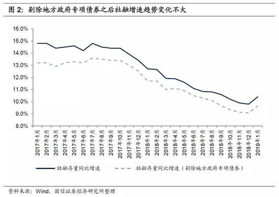 2019年地方政府债务置换规模将大幅减小(2018年末非政府债券形式存量政府债务仅剩3151亿元),继续把地方政府债券发行量纳入社融潜在较大误差,因此我们考虑把地方政府债券这个科目剔除掉。从历史数据来看,剔除该数据之后社融增速的数字会发生较大变化,但变化趋势没有区别。