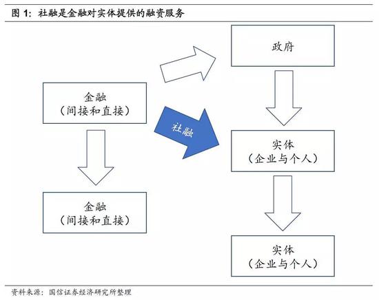 从定义上看,社融代表的是“金融体系”对“实体部门”的融资。按此定义,首先,它是“金融体系”提供的融资服务,包括银行、保险公司提供的间接金融,也包括资本市场提供的直接金融,而如果是实体与实体之间不通过金融体系完成的直接融资(比如两个实体企业之间直接发生的增资、借贷等。若不特别注意,本报告所称企业均指实体企业),则不体现在社融里;其次,社融反映的是“实体部门”获得的融资,而政府部门、金融部门获取的融资,也不统计在内。