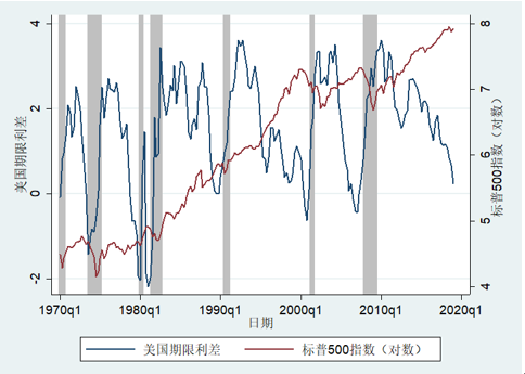 收益率倒挂,长期经常被视为美国衰退的先兆之一。美国从1970年到2018年的经济数据表明,当期限利差降到零以下即出现收益率倒挂后,美国经济会在几个季度后陷入衰退(图中用灰色柱表示),同时标普500股票指数也往往出现下跌。
