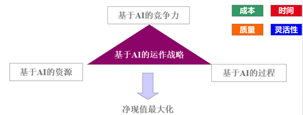 在思考人工智能的运作战略时,我们要思考几个问题:一个组织基于人工智能应该擅长什么运作? 应该培养哪种竞争力? 为了提供这种竞争力, 一个运作系统应该提供什么基于人工智能资源和基于人工智能过程? 基于AI的运作战略的定义是 :一个发展基于AI的资源和构造基于AI的过程的规划, 让导致的竞争力可以最大化组织的净现值。基于AI的运作战略的框架见下图。