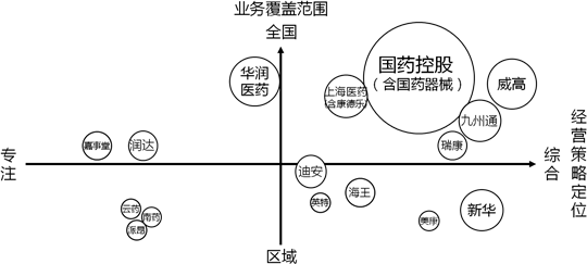 根据企业的业务覆盖范围与经营策略定位这两个维度,国内医疗器械流通企业可分为四大类,具体如图所示。
