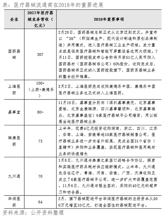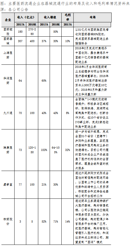 1) 国药控股:全国最大的药品配送商国药控股于2018 年7月11日公告,拟以51亿元价格收购集团兄弟公司、器械配送市占率第一的国药器材(国药器械的母公司),这意味器械配送行业第一和第二强强联合,公司预计2018年合并后的销售规模增长至近700亿,市占率提高到15-20%;