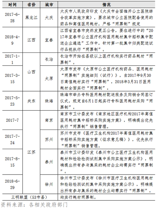 截至目前,全国各省基本已全面推行药品“两票制”,国家也希望将类似经验推广到器械耗材领域,以减少耗材中间流通环节,目前很多省份已陆续试水耗材“两票制”政策,预计未来2-3 年内耗材“两票制”有望在全国范围内陆续推行。2018年3月,国家卫计委官网刊出《关于巩固破除以药补医成果持续深化公立医院综合改革的通知》(国卫体改发〔2018〕4号)。 该《通知》由国家卫计委、财政部、人社部、发改委、中医药管理局、国务院医改办联合印发,定下了2018年及以后深化医改的重点领域和关键环节。 其中,《通知》明确提出,要逐步推行高值医用耗材购销“两票制”。
