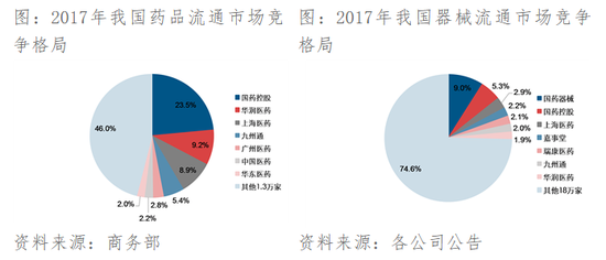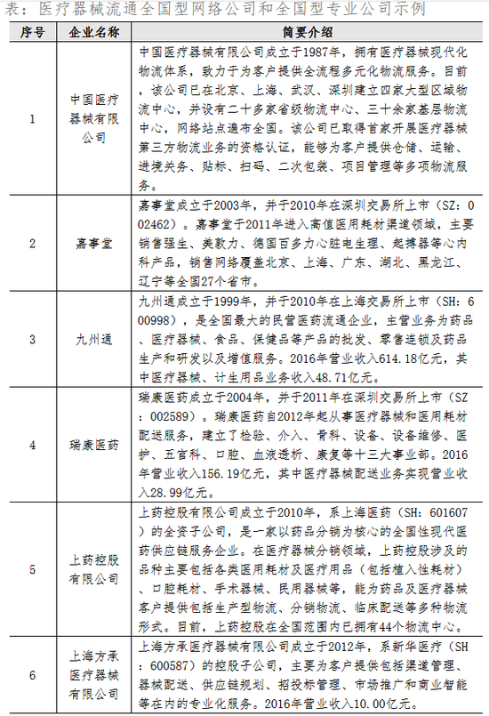 资料来源:公开资料整理这五点区别决定了器械配送市场高度分散,目前全市场器械配送企业约18 万家,远多于药品配送企业的1.3 万家,其中大多数是区域性小型经销商,经营的产品种类较少,面向的客户局限于县级或市级地域范围内少数医院。根据华泰证券的测算,2017 年器械配送市场CR3 为17%,远低于药品配送市场42%的CR3。