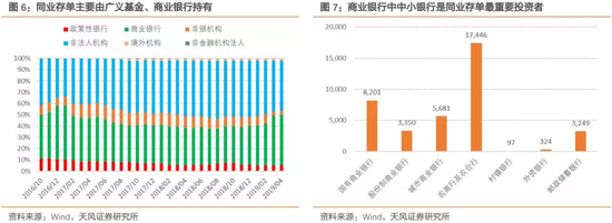 更重要的冲击是由此带来的交叉风险。当前同业存单的投资者比较集中,广义基金持有4.4万亿,占比45%,商业银行持有规模与之相近。