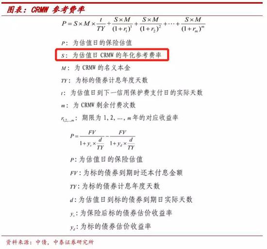 5)费率与违约率、违约损失率挂钩。由下表CRWM费率计算公式可知,费率取决于估值日的保险估值,而保险估值取决于标的债券到期时还本付息金额。由目前已发行的CRMW来看,费率区间在0.2%-3.1%。
